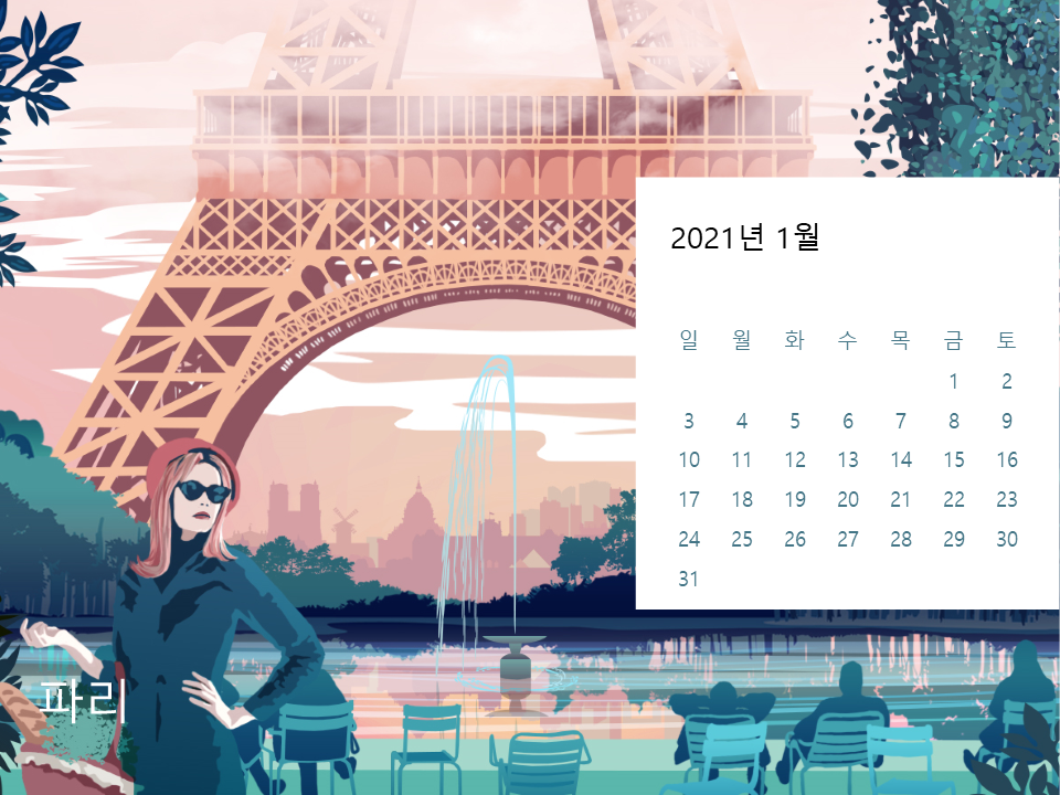 새해에는 월간 계획을 준비하면서 이곳저곳에서 달력들을 다운로드하여서 사용할 텐데요. MS에서도 제공하는 무료 달력이 있다는 사실 아십니까? 쉽게 파워포인트만 접속해도 아름다운 일러스트의 달력을 사용할 수 있답니다. 다만 한복을 입고 있는 한국의 서울이 빠진 것이 아쉽네요. 아무튼 첫 번째 1월은 파리의 에펠탑으로 장식을 했습니다. 그래서 오늘은 에펠탑에 대한 짧은 이야기와 제2차 세계 대전을 중심으로 연도별 세계사와 한국사를 살펴보는 시간을 갖도록 하겠습니다.